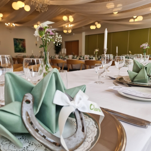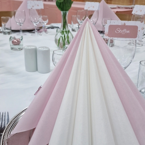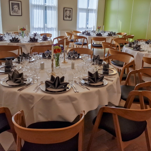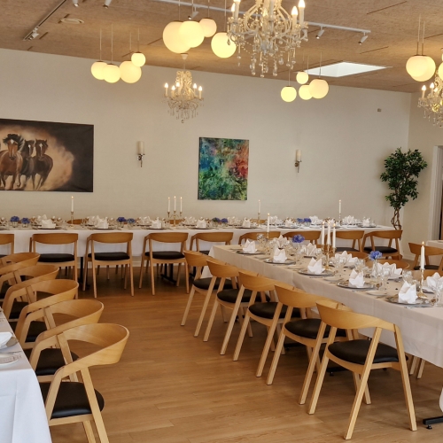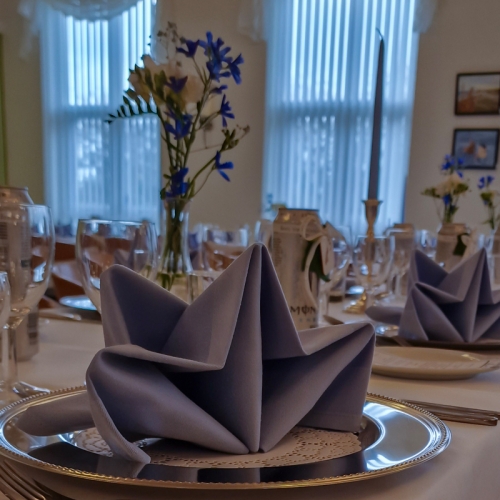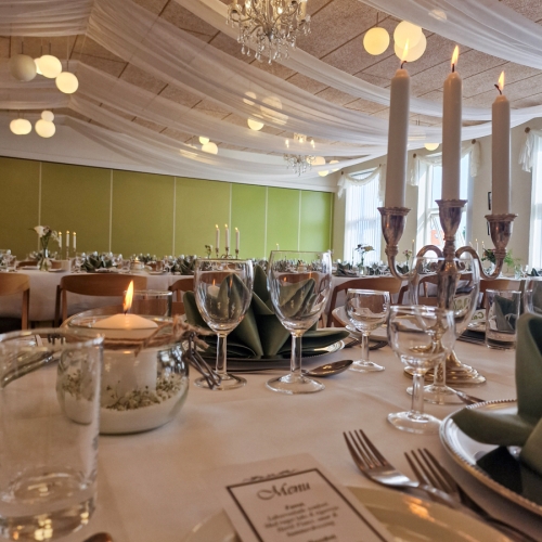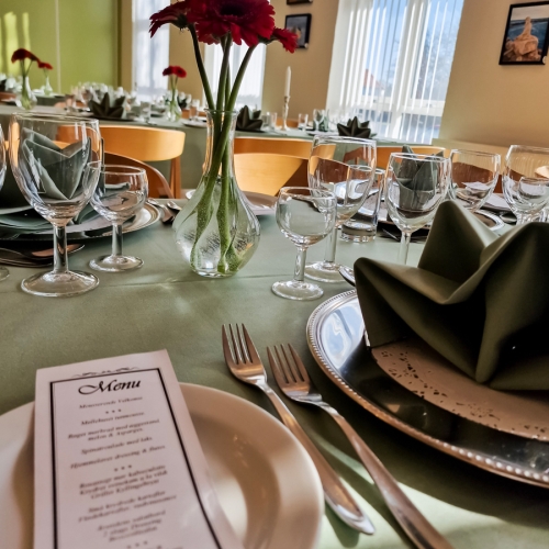 - Smuk borddækning med stofduge og stofservietter, lys og blomster, menukort og selvfølgelig den gode mad og vin.Du får gratis indbydelser, og så har vi en sød og venlig betjening.